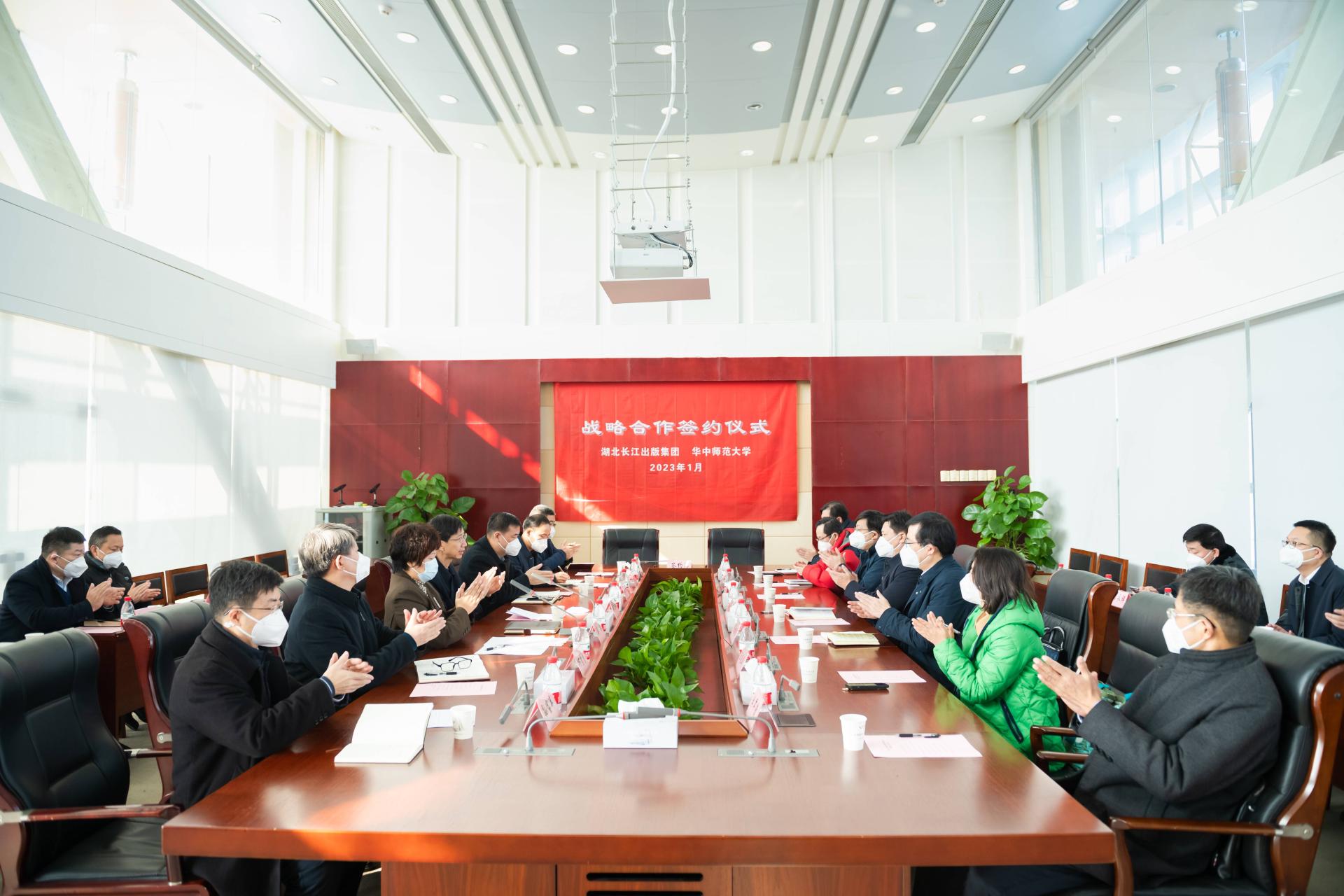 1月4日,湖北长江出版集团与我校战略合作签约仪式在长江出版城举行。集团党委书记、董事长黄国斌,集团党委副书记、总裁毕华,校党委书记赵凌云、校党委副书记陈迪明出席。双方相关部门负责人参加。签约仪式由毕华主持。