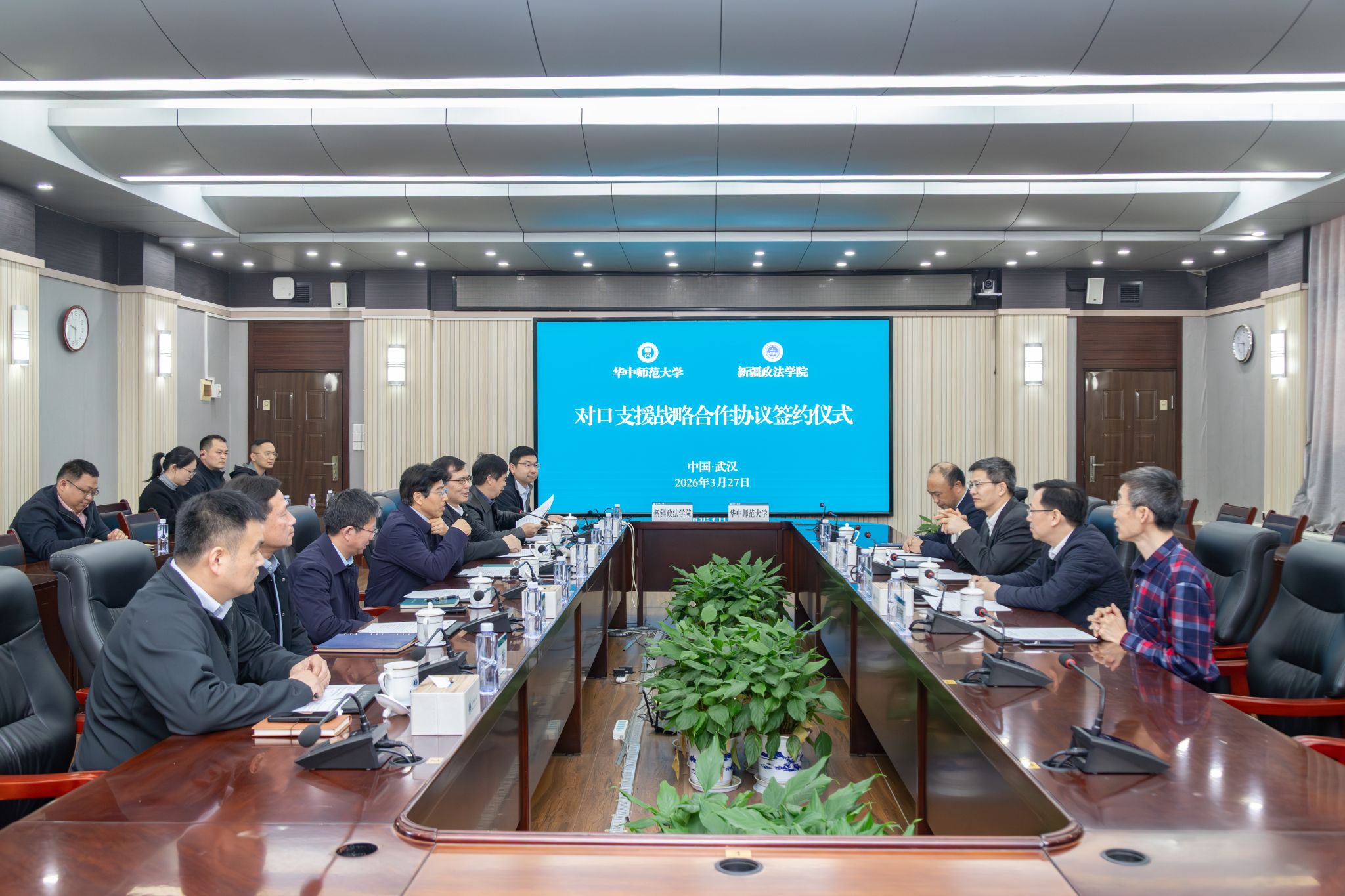 3月27日,我校与新疆政法学院对口支援战略合作协议签约仪式在行政楼一楼会议室举行。新疆政法学院党委副书记、执行副校长王青斌,党委常委、副校长杨臣;华中师范大学校长彭双阶,党委副书记陈迪明出席仪式。仪式由陈迪明主持。
