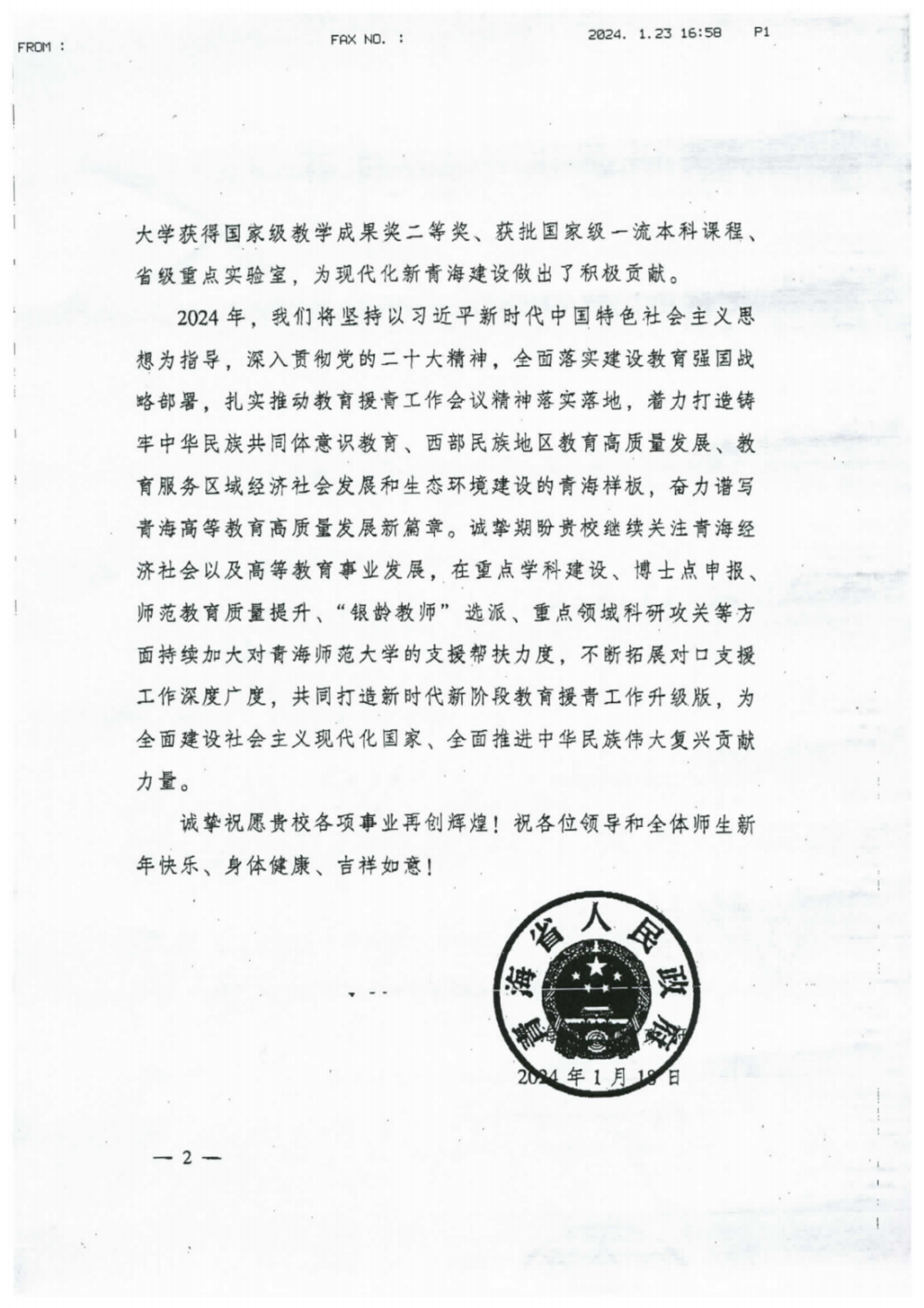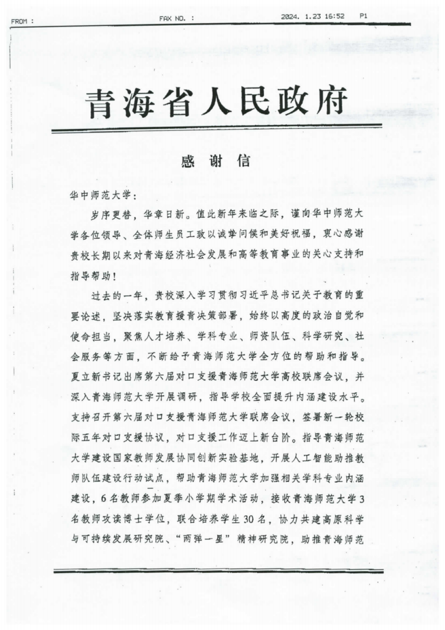 (通讯员 程浩)近日,青海省人民政府发来感谢信,对我校长期以来对青海经济社会发展和高等教育事业的关心支持和指导帮助表示感谢。感谢信中指出,我校在人才培养、学科专业、师资队伍、科学研究、社会服务等方面,给予了青海师范大学全方位的帮助与指导,为青海地区的教育事业发展作出了积极贡献。