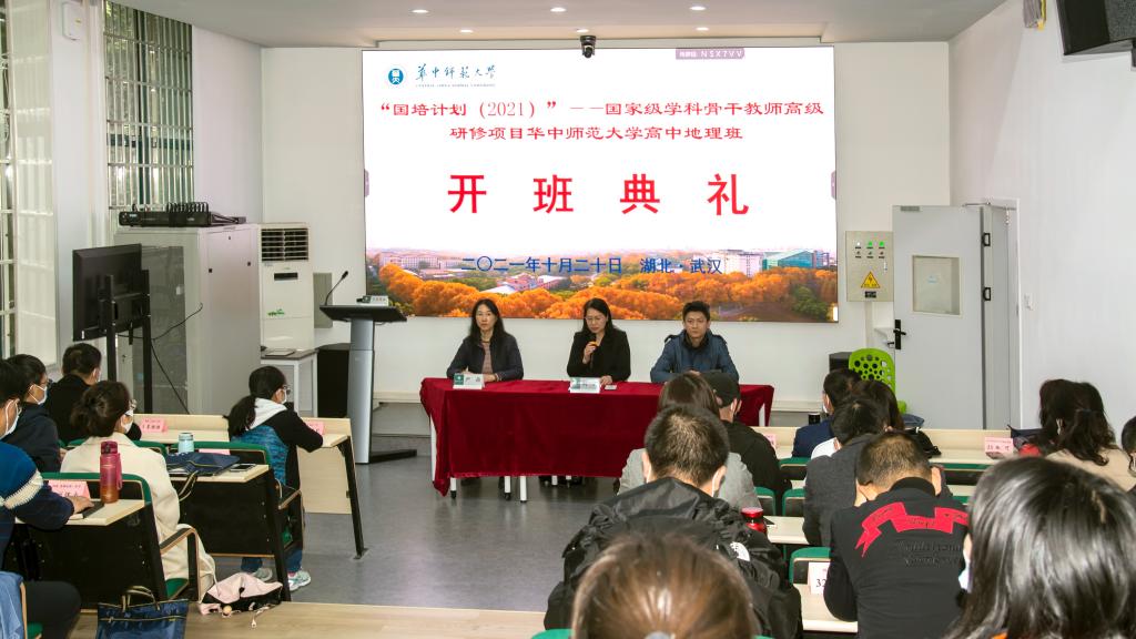 2021年10月20日上午,教育部“国培计划(2021)”——国家级学科骨干教师高级研修项目(高中地理)开班典礼在我校举行。华中师范大学人工智能教育学部副部长、教师教育学院院长何静、中小学教师培训部主任周尤,研修班班主任严莉以及来自全国30个省市区近40名高中地理骨干教师参加了典礼。典礼由周尤主持。