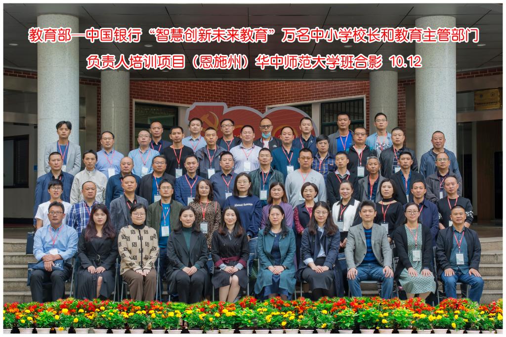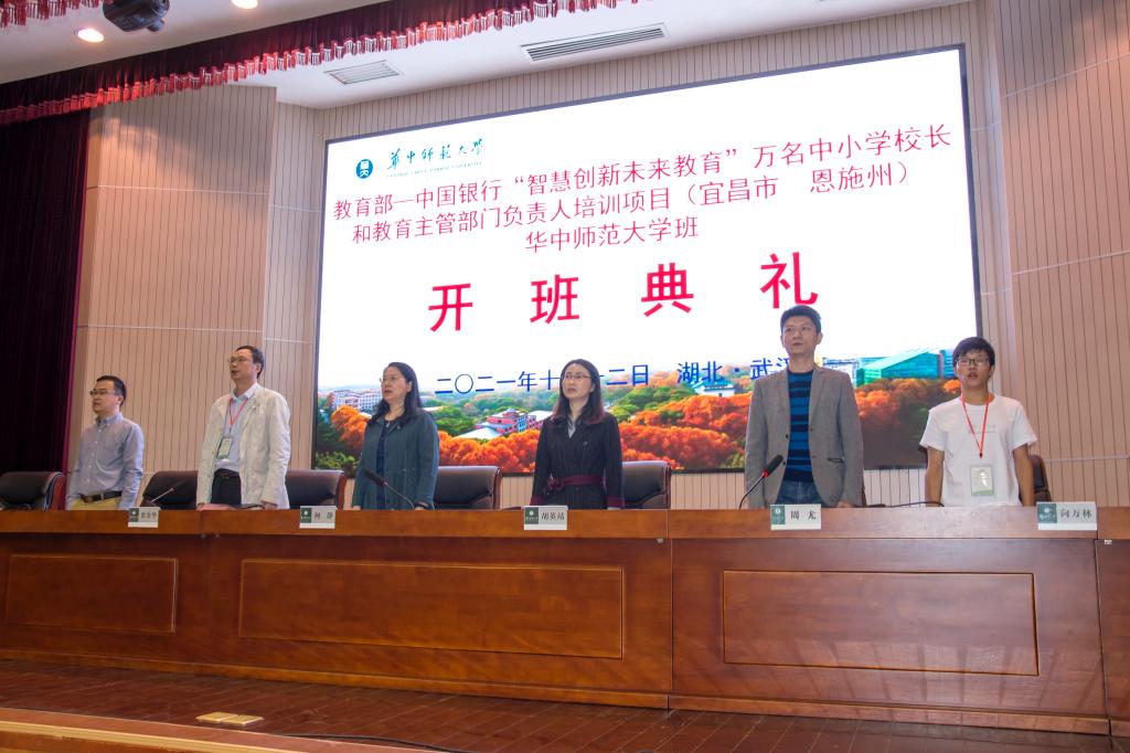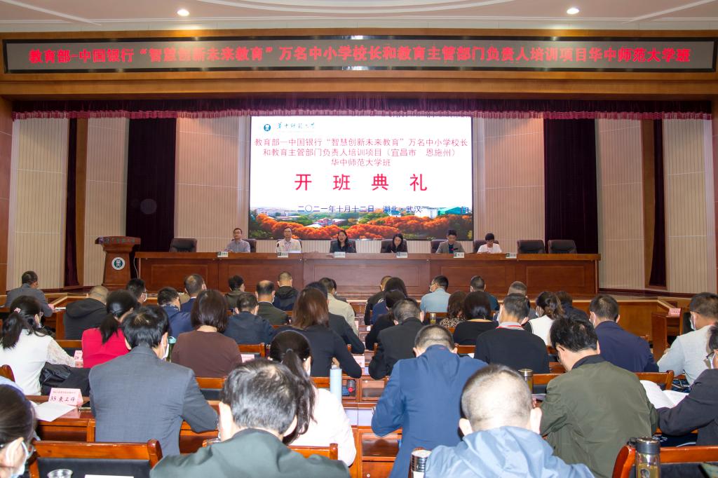 2021年10月12日上午,教育部—中国银行“智慧创新未来教育”万名中小学校长和教育主管部门负责人培训项目(宜昌市、恩施州)开班典礼在我校举行。华中师范大学教师教育学院院长何静、中国银行湖北省分行个人数字金融部副总经理胡英靖、宜昌市教育局四级调研员张金华、研修班班主任以及来自宜昌市、恩施州的100名学员参加了开班典礼。