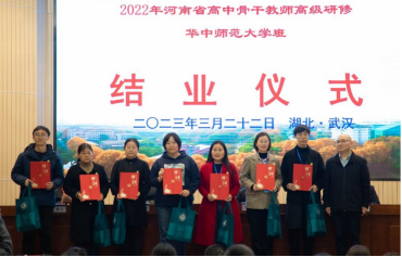 通讯员 连亚辉 王世存3月22日下午,由河南省教育厅、河南省基础教育课程与教学发展中心和华中师范大学主办,化学学院承办的“2022年河南省高中骨干教师高级研修华中师范大学班”结业仪式在科学会堂顺利举行。学校国内合作与培训管理处培训办主任梁皓东、学校本科招生办公室主任张德华、我院党委书记邱宝国、副院长原弘、班主任王世存、欧阳素、学员代表杜永亮等出席会议,本次参训的英语、化学、生物三个学科骨干教师235人参加了结班仪式。