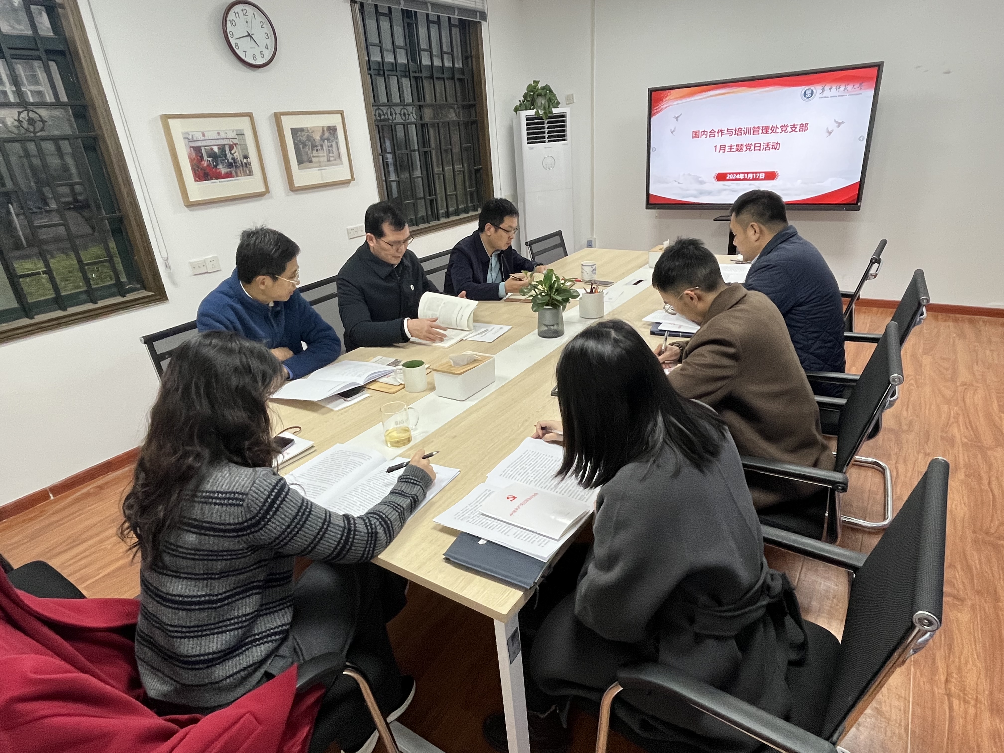 1月17日下午,国内合作与培训管理处党支部在行政楼附楼104会议室开展了1月份主题党日活动,支部全体党员参加。活动由党支部书记罗高峰同志主持,校党委副书记陈迪明出席。