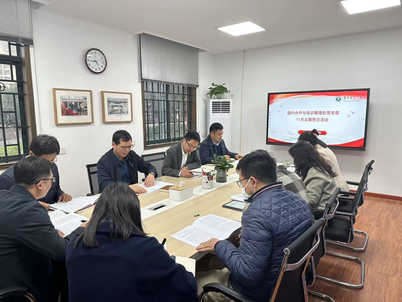 11月28日下午,国内合作与培训管理处党支部在行政楼附楼104会议室开展了11月份主题党日活动。支部全体党员参与了活动,活动由党支部书记罗高峰同志主持,校党委副书记陈迪明出席。