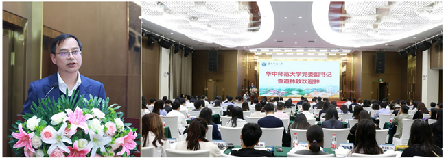 伴随着雄壮的国歌声,全场肃立致敬,仪式正式开始。华中师范大学党委副书记查道林在致辞中简要介绍了华中师范大学的发展历史、办学特色,以及近年来学校在教育信息化等领域取得的丰富成就。他强调学校高度重视与香港的教育交流合作,致力于打造立体的教育交流环境,学校与香港中联办、香港教育局等部门建立了长期、良好的合作关系。他祝愿本次活动将有助于香港新入职教师提升专业能力,加深对中华文化的认识和理解,促进鄂港两地教师信息化共享与共同发展,为香港的繁荣发展和中华民族的伟大复兴做出贡献。